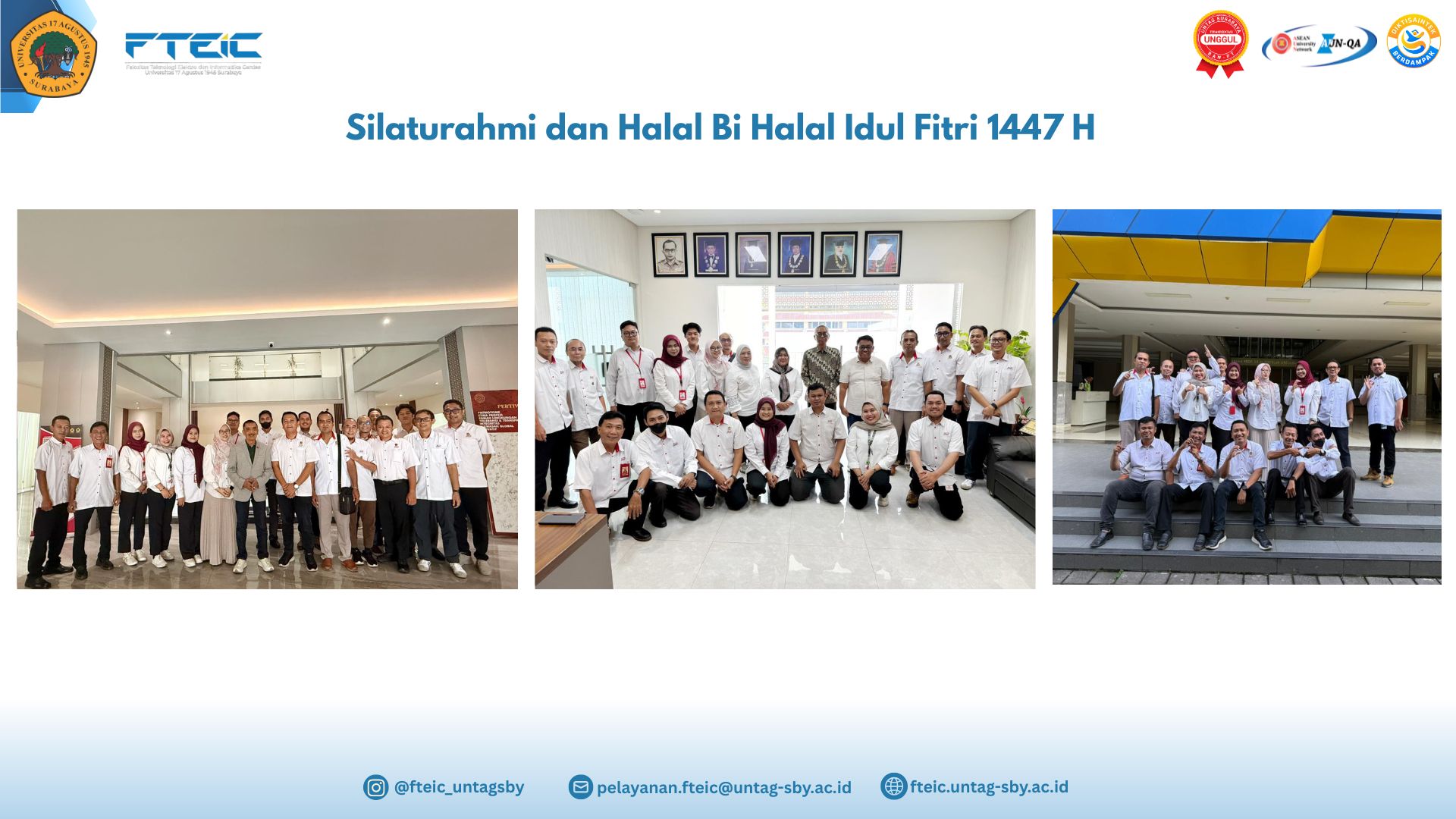 Dalam suasana penuh kehangatan pasca perayaan Idulfitri, Fakultas Teknologi Elektro dan Informatika Cerdas (FTEIC) Universitas 17 Agustus 1945 Surabaya melakukan kegiatan Silaturahmi dan Halal Bi Halal bersama jajaran Yayasan Perguruan 17 Agustus 1945 Surabaya dan Rektorat UNTAG Surabaya. Kegiatan ini menjadi momentum penting untuk mempererat silaturahmi serta memperkuat sinergi sivitas akademika di lingkungan kampus UNTAG Surabaya.