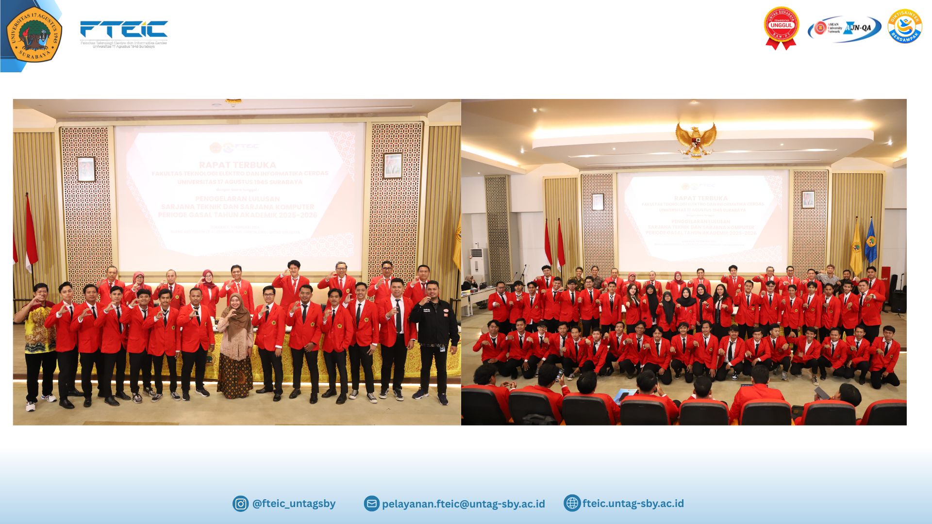 Telah dilaksanakan kegiatan Penggelaran Sarjana Teknik dan Sarjana Komputer Fakultas Teknologi Elektro dan Informatika Cerdas Universitas 17 Agustus 1945 pada Senin, 9 Februari 2026.