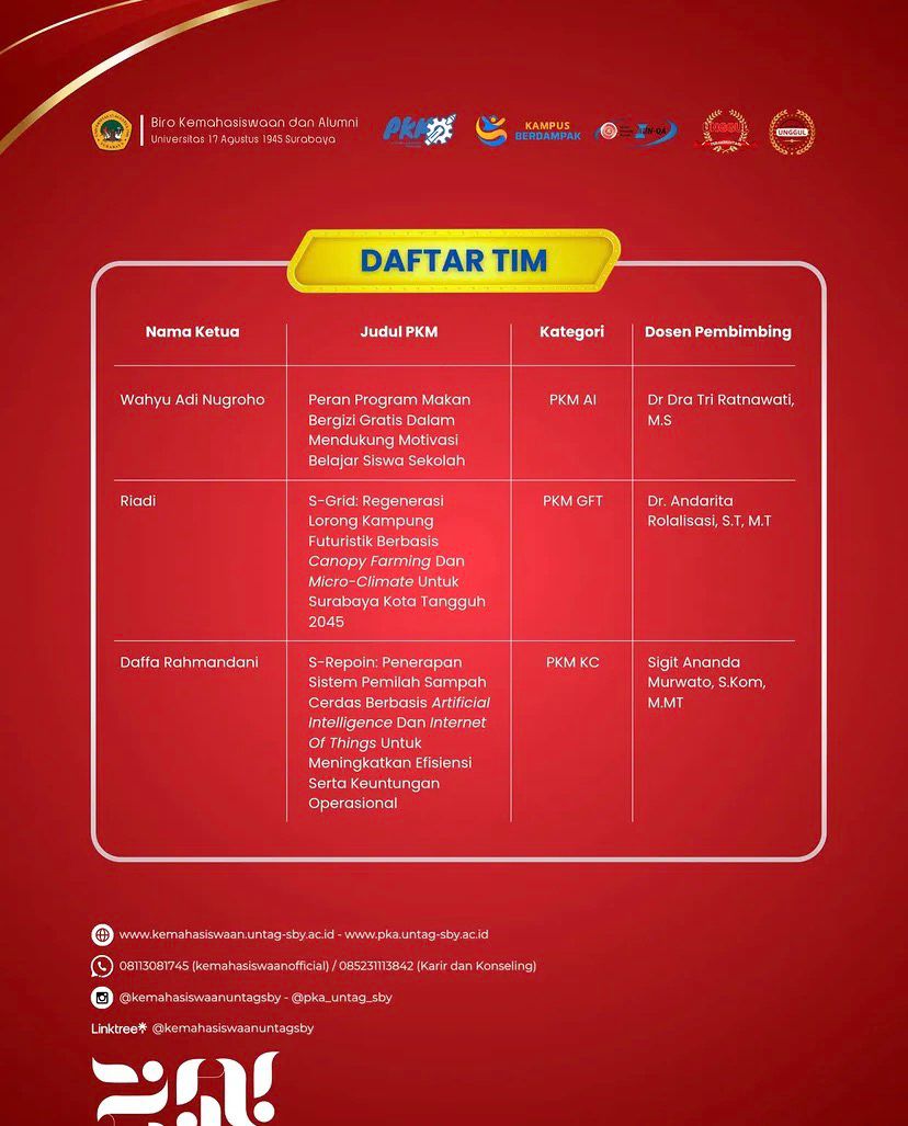 FTEIC UNTAG Surabaya menyampaikan apresiasi dan ucapan selamat kepada peserta yang proposal PKMnya lolos seleksi internal. Semoga keberhasilan ini menjadi motivasi untuk terus berkarya, berinovasi, dan memberikan kontribusi terbaik bagi bangsa dan negara.